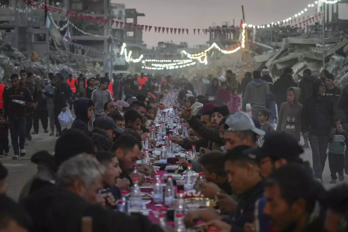 Palestinians sit at a large table surrounded by the rubble of destroyed homes and buildings as they gather for iftar, the fast-breaking meal, on the first day of Ramadan in Rafah, southern Gaza Strip, Saturday, March 1, 2025 (AP Photo/Abdel Kareem Hana)