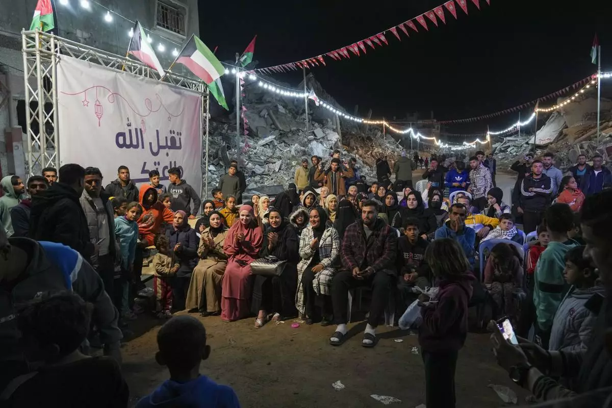 Palestinians gather to celebrate after iftar, the fast-breaking meal, on the first day of Ramadan in Rafah, southern Gaza Strip, Saturday, March 1, 2025 (AP Photo/Abdel Kareem Hana)