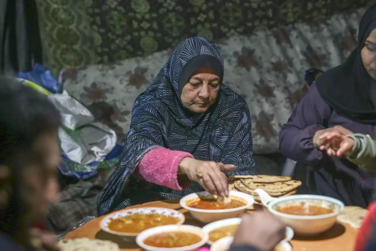 Fatima Al-Absi shares iftar, the fast-breaking meal, with her daughter and grandchildren on the first day of Ramadan in their damaged apartment in Jabaliya, northern Gaza Strip, on Saturday, March 1, 2025. (AP Photo/Jehad Alshrafi)