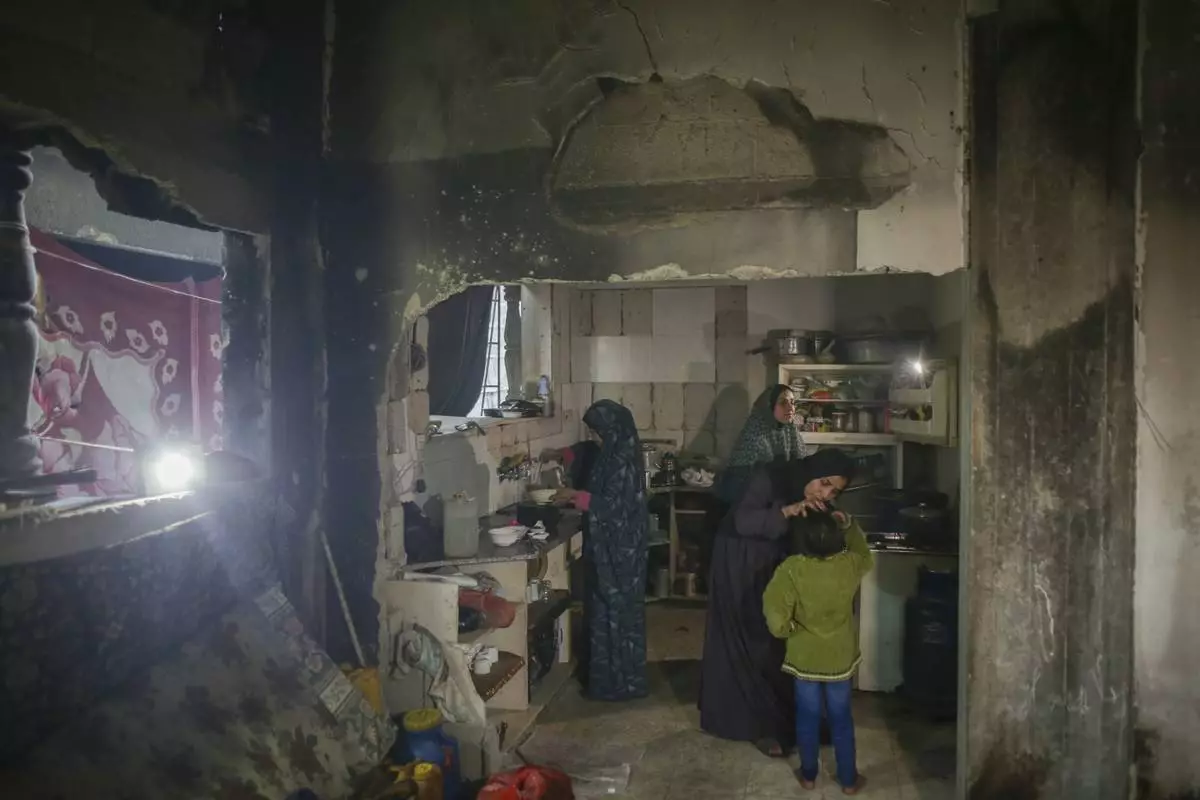 The family of Fatima Al-Absi share Iftar, the fast-breaking meal, on the first day of Ramadan in their damaged apartment in Jabaliya, northern Gaza Strip, on Saturday, March 1, 2025. (AP Photo/Jehad Alshrafi)