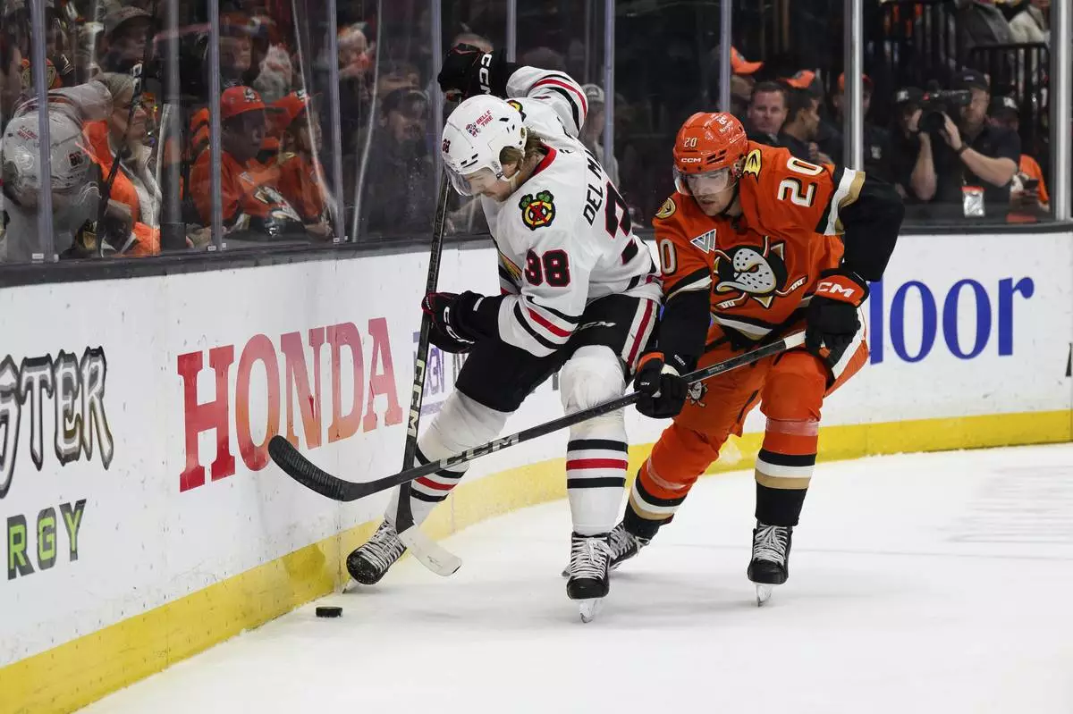 Chicago Blackhawks defenseman Ethan Del Mastro, left, and Anaheim Ducks right wing Brett Leason (20) vie for the puck during the first period of an NHL hockey game Saturday, March 1, 2025, in Anaheim, Calif. (AP Photo/William Liang)