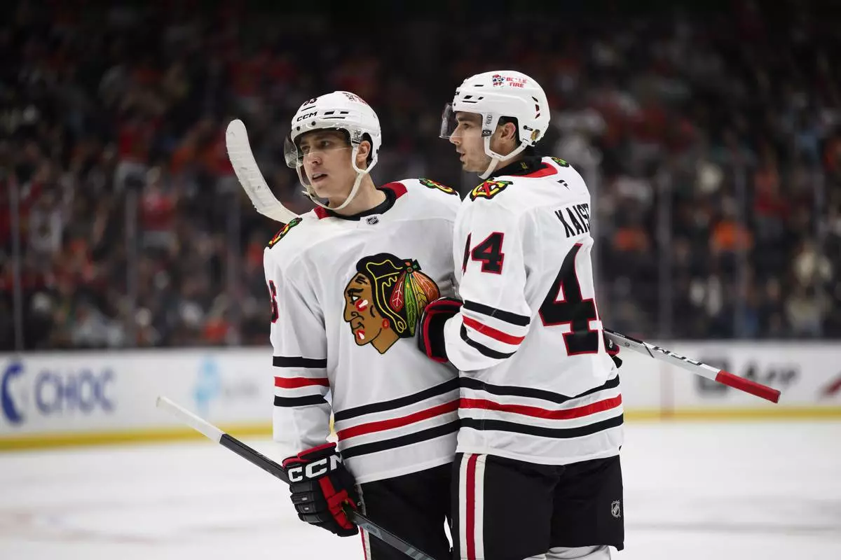 Chicago Blackhawks center Teuvo Teravainen, left, celebrates after his goal with defenseman Wyatt Kaiser, right, during the second period of an NHL hockey game against the Anaheim Ducks, Saturday, March 1, 2025, in Anaheim, Calif. (AP Photo/William Liang)