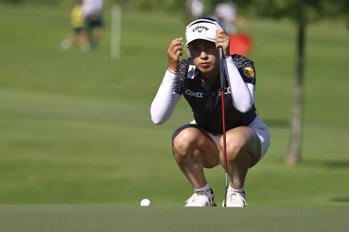 Jeeno Thitikul of Thailand lines up her shot during the round four of the HSBC Women's World Championship 2025 at Sentosa Golf Club in Singapore, Sunday, March 2, 2025. (AP Photo/Suhaimi Abdullah)