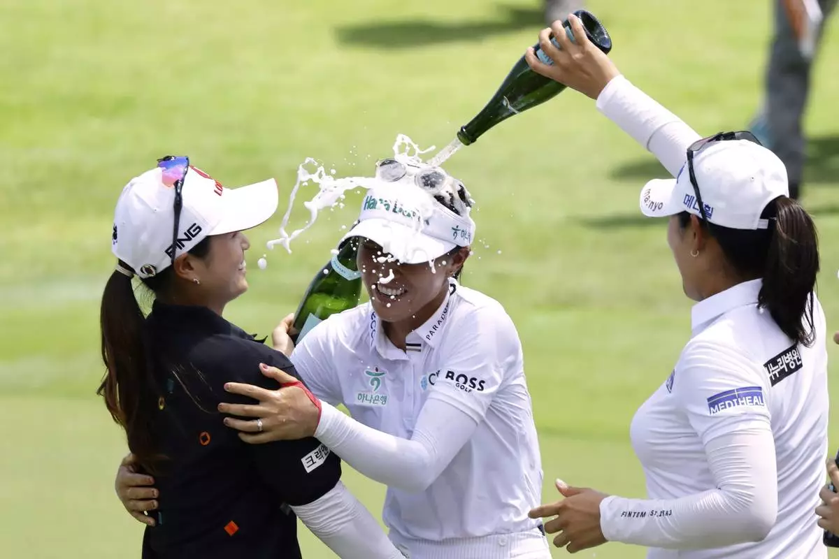 Lydia Ko of New Zealand is doused with champagne after winning the HSBC Women's World Championship 2025 at Sentosa Golf Club in Singapore, Sunday, March 2, 2025. (AP Photo/Suhaimi Abdullah)