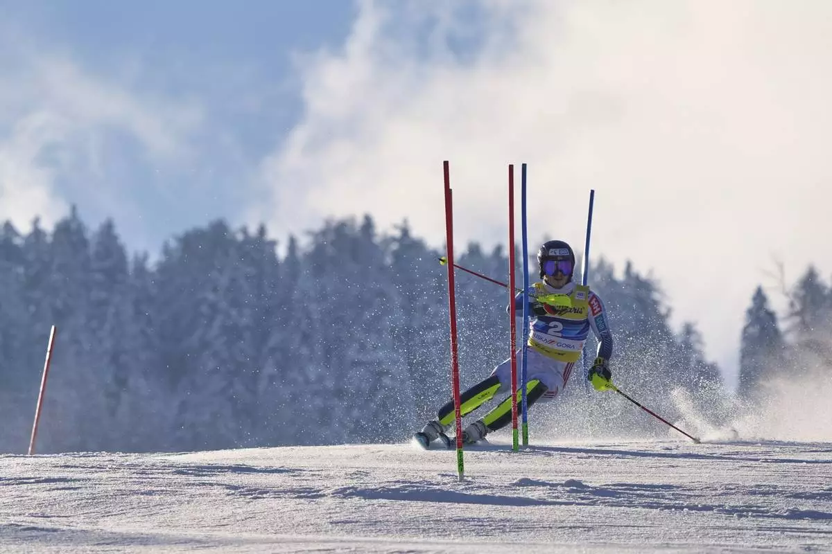 Switzerland's Loic Meillard competes in an alpine ski, men's World Cup slalom, in Kranjska Gora, Slovenia, Sunday, March 2, 2025. (AP Photo/Pier Marco Tacca)