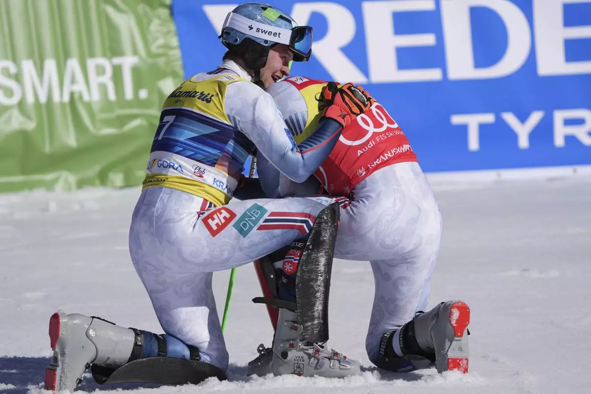 Norway's Henrik Kristoffersen, right, winner of an alpine ski, men's World Cup slalom, celebrates with second-placed Norway's Timon Haugan, in Kranjska Gora, Slovenia, Sunday, March 2, 2025. (AP Photo/Giovanni Auletta)