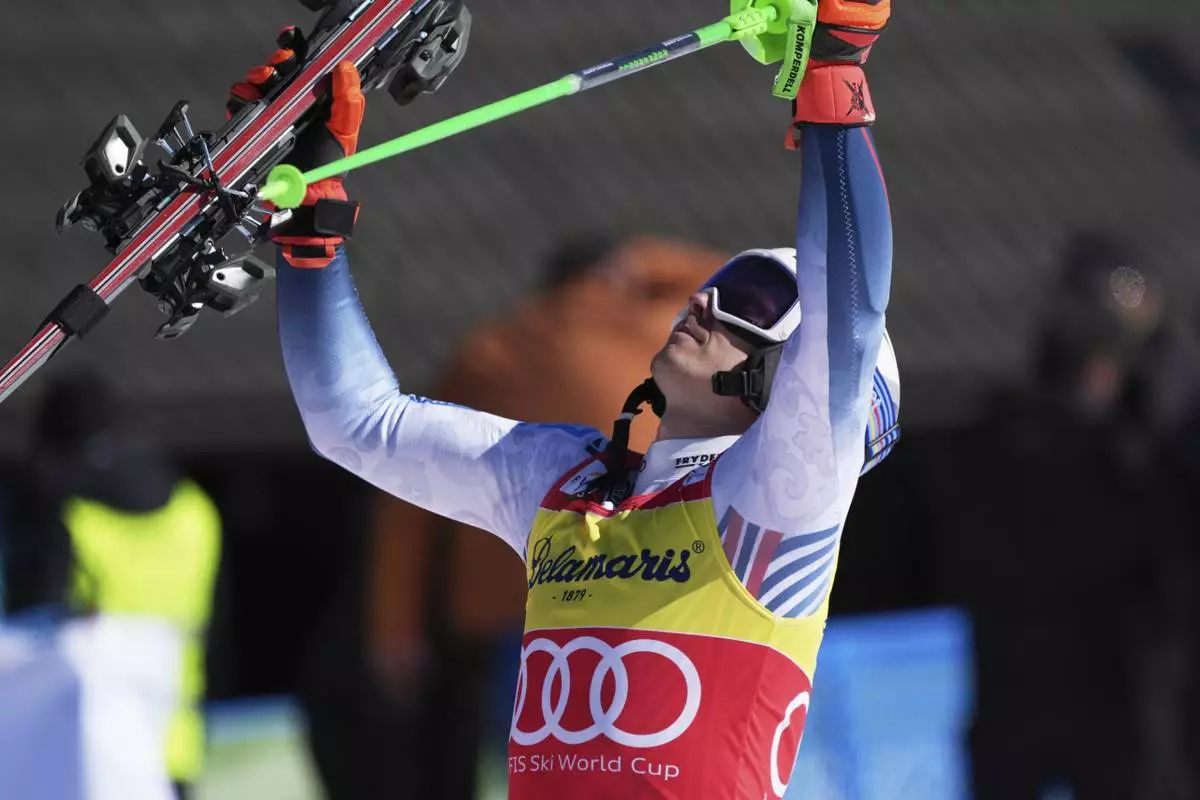 Norway's Henrik Kristoffersen celebrates winning an alpine ski, men's World Cup slalom, in Kranjska Gora, Slovenia, Sunday, March 2, 2025. (AP Photo/Giovanni Auletta)