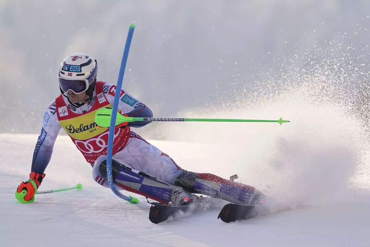 Norway's Henrik Kristoffersen competes in an alpine ski, men's World Cup slalom, in Kranjska Gora, Slovenia, Sunday, March 2, 2025. (AP Photo/Pier Marco Tacca)