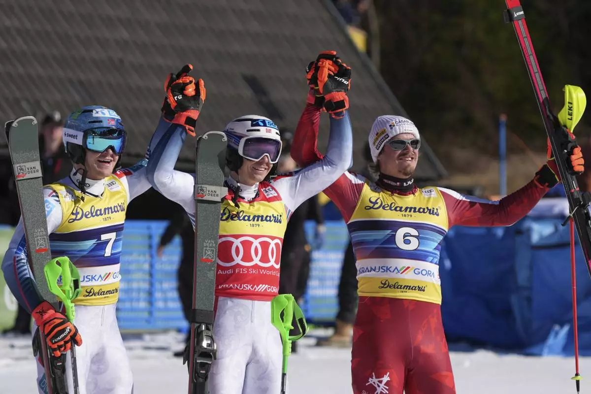 Norway's Henrik Kristoffersen, center, winner of an alpine ski, men's World Cup slalom, celebrates with second-placed Norway's Timon Haugan, left, and third-placed Austria's Manuel Feller, in Kranjska Gora, Slovenia, Sunday, March 2, 2025. (AP Photo/Giovanni Auletta)