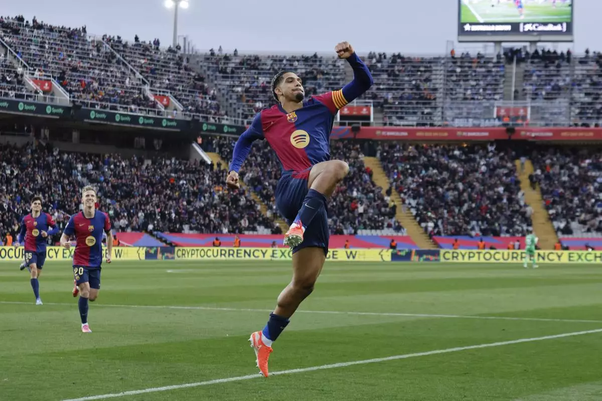 Barcelona's Ronald Araujo celebrates scoring his side's 3rd goal during the Spanish La Liga soccer match between Barcelona and Real Sociedad at the Lluis Companys Olympic Stadium in Barcelona, Spain, Sunday, March 2, 2025. (AP Photo/Joan Monfort)