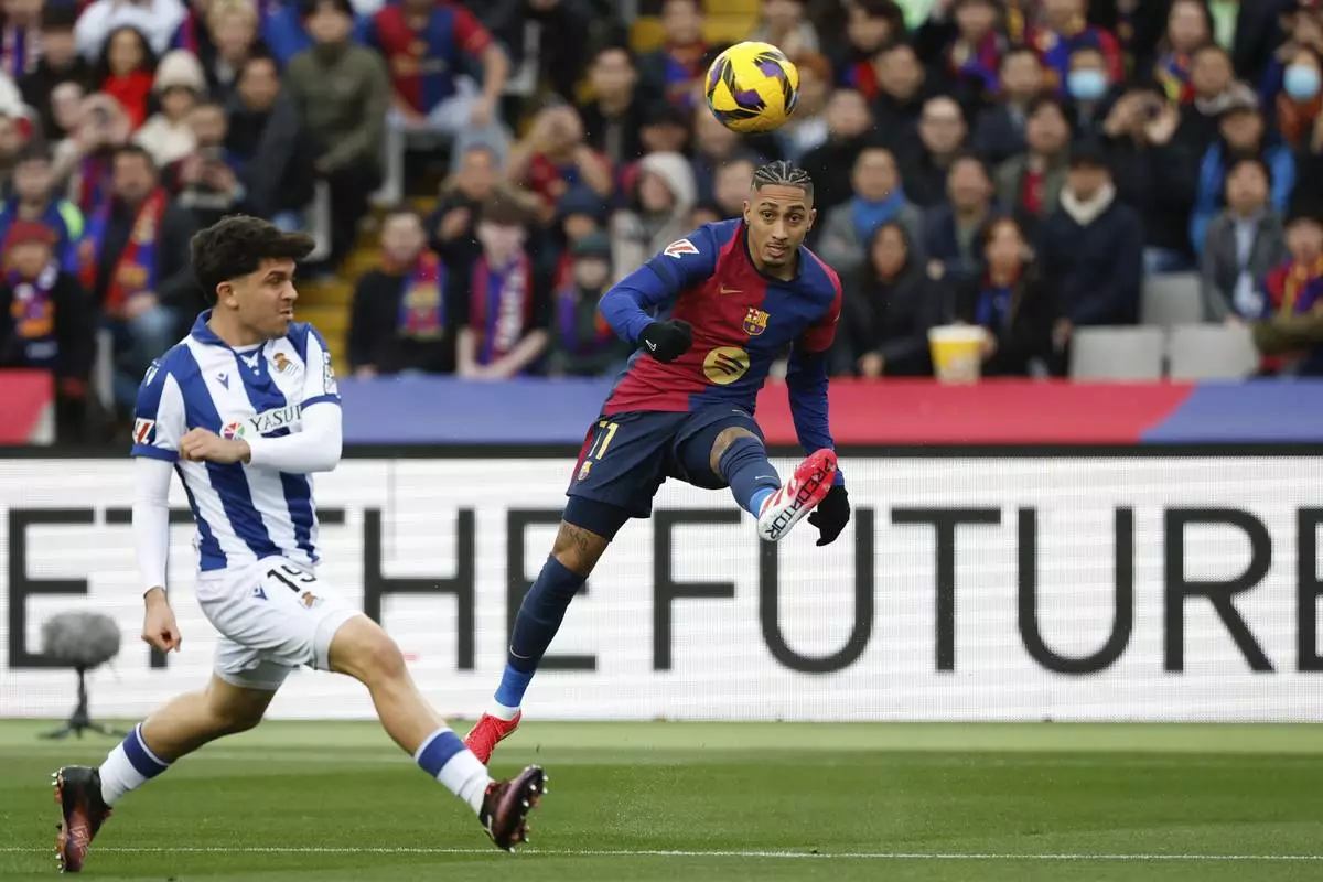 Barcelona's Raphinha, right, passes the ball challenged by Real Sociedad's Jon Aramburu during the Spanish La Liga soccer match between Barcelona and Real Sociedad at the Lluis Companys Olympic Stadium in Barcelona, Spain, Sunday, March 2, 2025. (AP Photo/Joan Monfort)