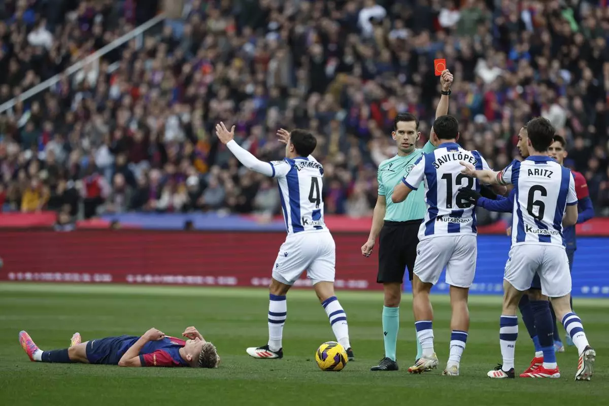 Referee Alejandro Quintero Gonzalez shows a red card to Real Sociedad's Aritz Elustondo (6) as Barcelona's Dani Olmo lies on the pitch during the Spanish La Liga soccer match between Barcelona and Real Sociedad at the Lluis Companys Olympic Stadium in Barcelona, Spain, Sunday, March 2, 2025. (AP Photo/Joan Monfort)