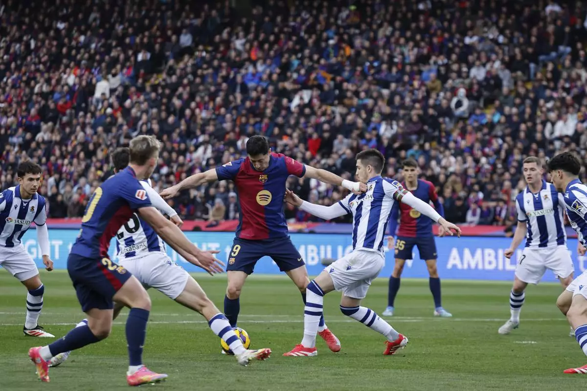Barcelona's Robert Lewandowski (9) is challenged by Real Sociedad's Igor Zubeldia during the Spanish La Liga soccer match between Barcelona and Real Sociedad at the Lluis Companys Olympic Stadium in Barcelona, Spain, Sunday, March 2, 2025. (AP Photo/Joan Monfort)