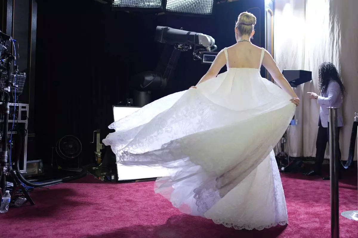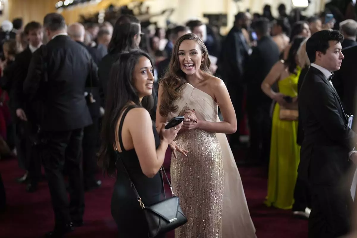 Hannah Stocking arrives at the Oscars on Sunday, March 2, 2025, at the Dolby Theatre in Los Angeles. (AP Photo/John Locher)