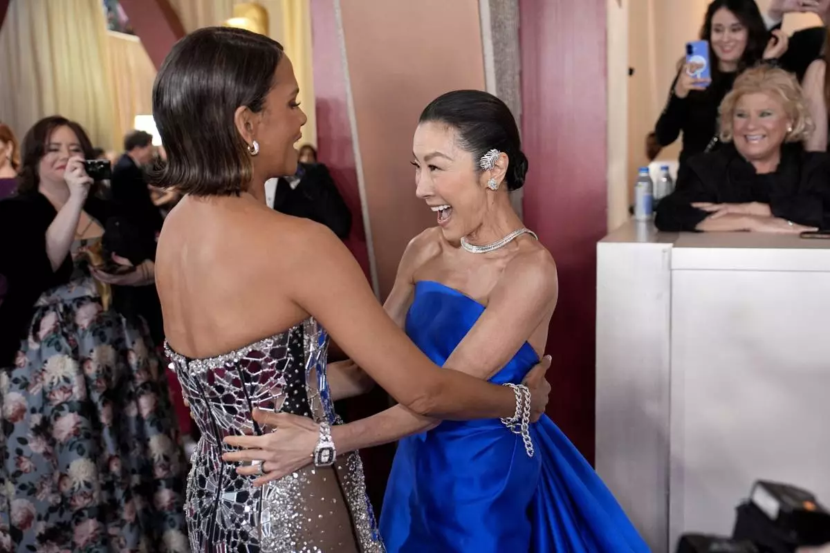 Halle Berry, left, and Michelle Yeoh arrive at the Oscars on Sunday, March 2, 2025, at the Dolby Theatre in Los Angeles. (AP Photo/John Locher)