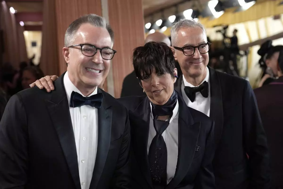 Chief Executive Officer of the Academy of Motion Picture Arts and Sciences, Bill Kramer, from left, Diane Warren and Peter Cipkowsk arrive at the Oscars on Sunday, March 2, 2025, at the Dolby Theatre in Los Angeles. (AP Photo/John Locher)