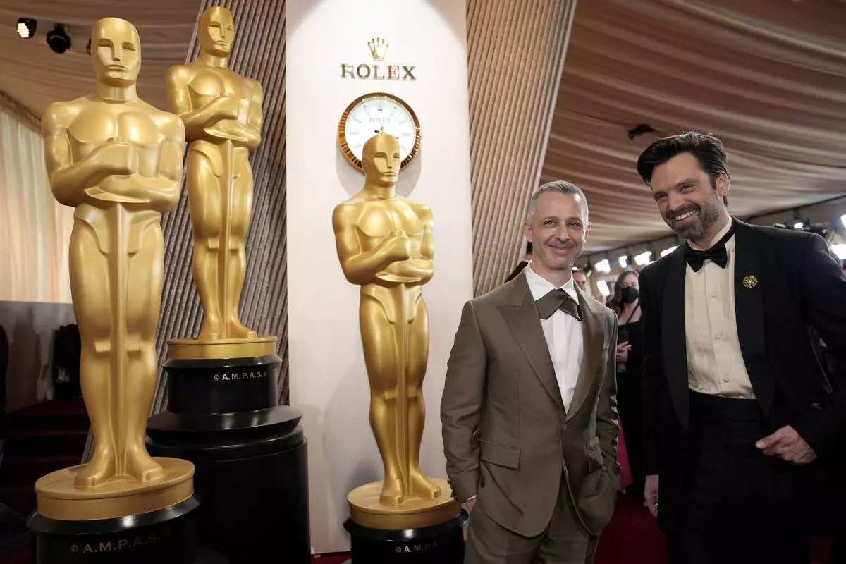 Jeremy Strong, left, and Sebastian Stan arrive at the Oscars on Sunday, March 2, 2025, at the Dolby Theatre in Los Angeles. (AP Photo/John Locher)