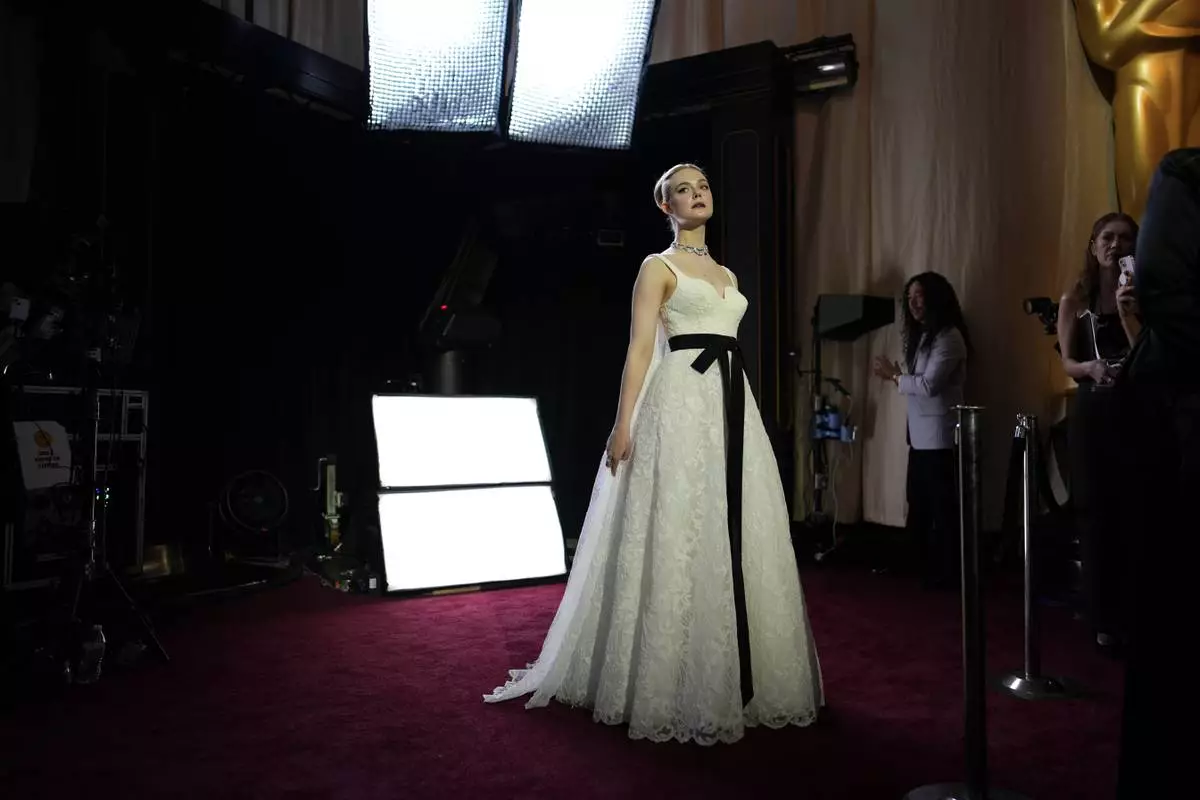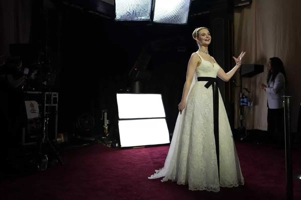 Elle Fanning arrives at the Oscars on Sunday, March 2, 2025, at the Dolby Theatre in Los Angeles. (AP Photo/John Locher)