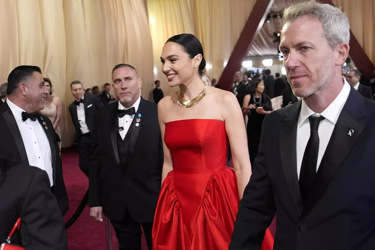 Gal Gadot, left, and Jaron Varsano arrive at the Oscars on Sunday, March 2, 2025, at the Dolby Theatre in Los Angeles. (AP Photo/John Locher)