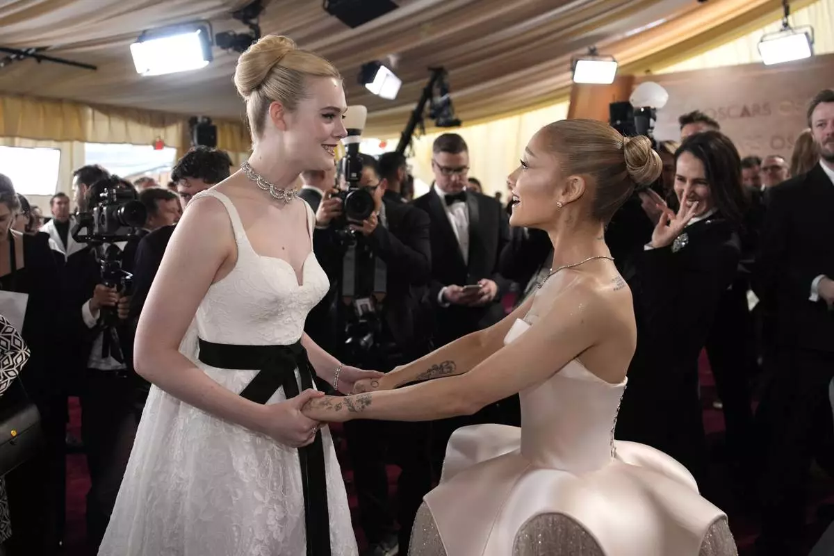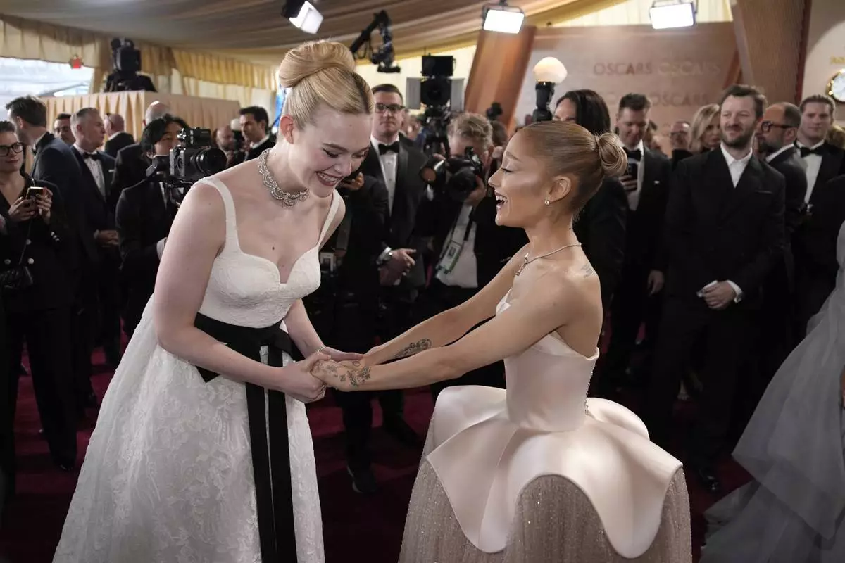 Elle Fanning, left, and Ariana Grande arrive at the Oscars on Sunday, March 2, 2025, at the Dolby Theatre in Los Angeles. (AP Photo/John Locher)