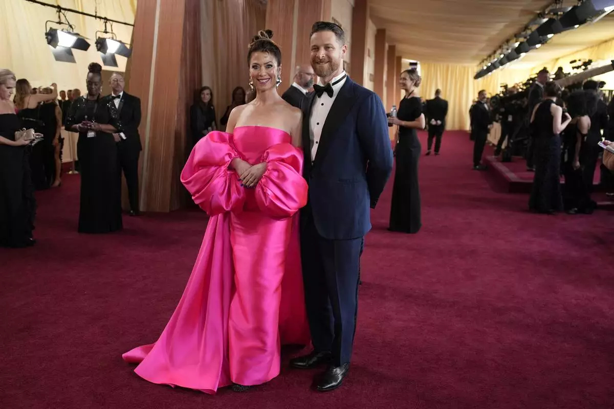 Danya Devorah, left, and D.J. Gugenheim arrive at the Oscars on Sunday, March 2, 2025, at the Dolby Theatre in Los Angeles. (AP Photo/John Locher)
