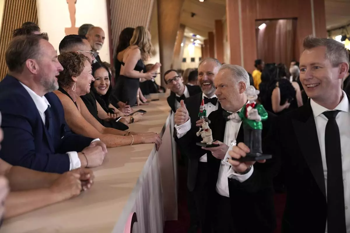 Nick Park, from left, Richard Beek and Merlin Crossingham arrive at the Oscars on Sunday, March 2, 2025, at the Dolby Theatre in Los Angeles. (AP Photo/John Locher)