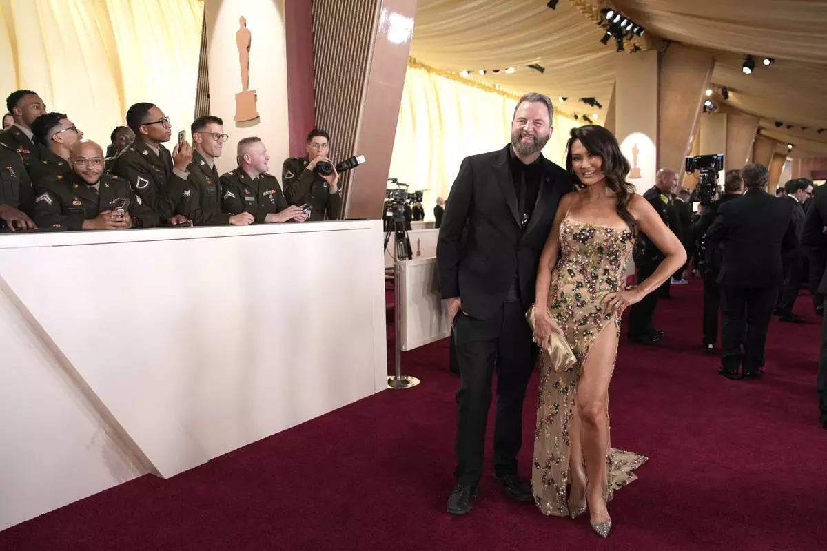 Paul Debevec, left, and Tia Carrere arrive at the Oscars on Sunday, March 2, 2025, at the Dolby Theatre in Los Angeles. (AP Photo/John Locher)