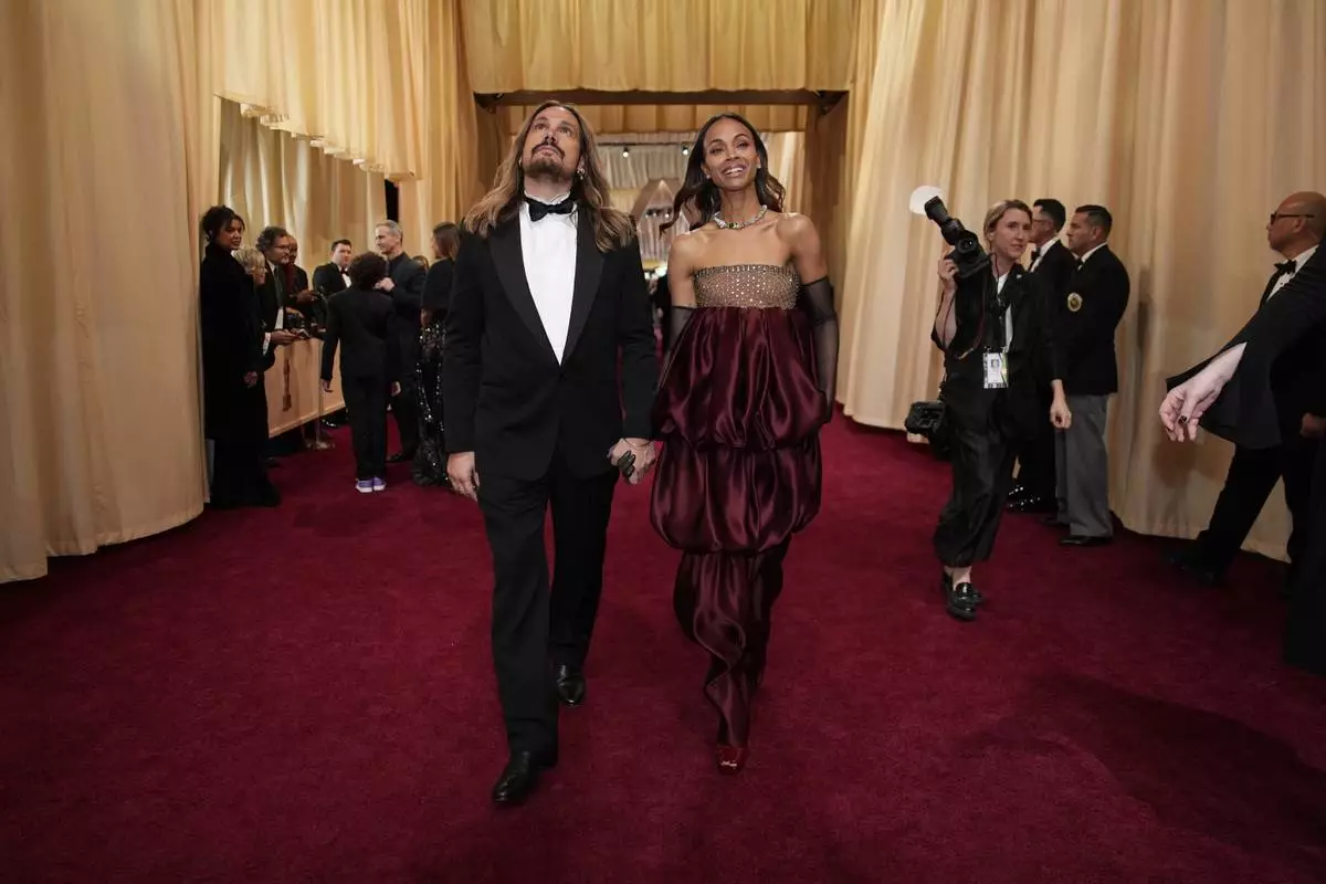 Marco Perego-Saldana, left, and Zoe Saldana arrive at the Oscars on Sunday, March 2, 2025, at the Dolby Theatre in Los Angeles. (AP Photo/John Locher)
