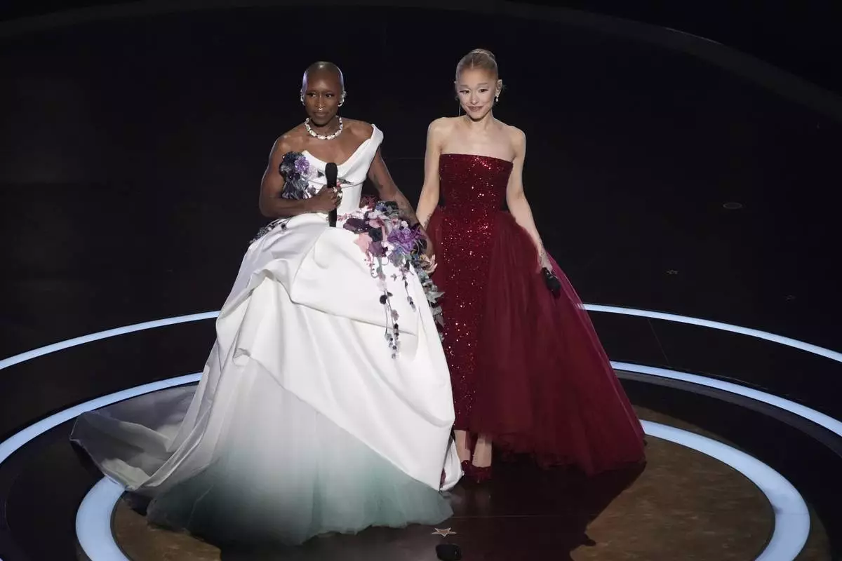 Cynthia Erivo left, and Ariana Grande on stage during the Oscars on Sunday, March 2, 2025, at the Dolby Theatre in Los Angeles. (AP Photo/Chris Pizzello)
