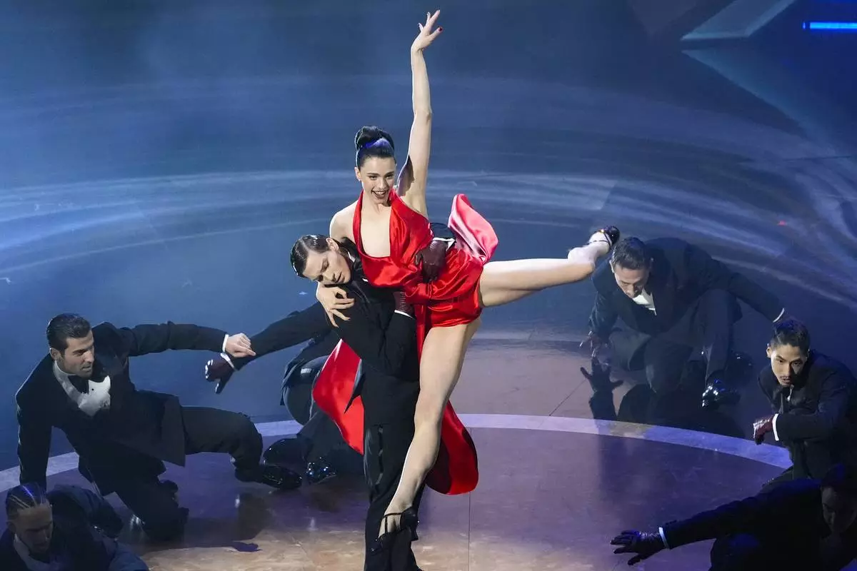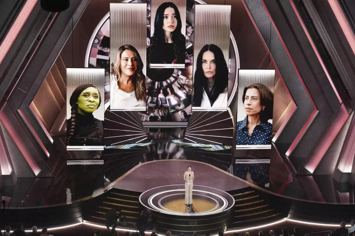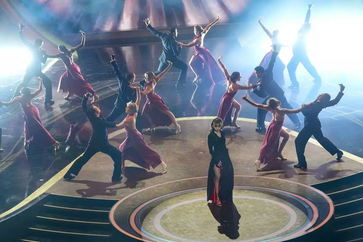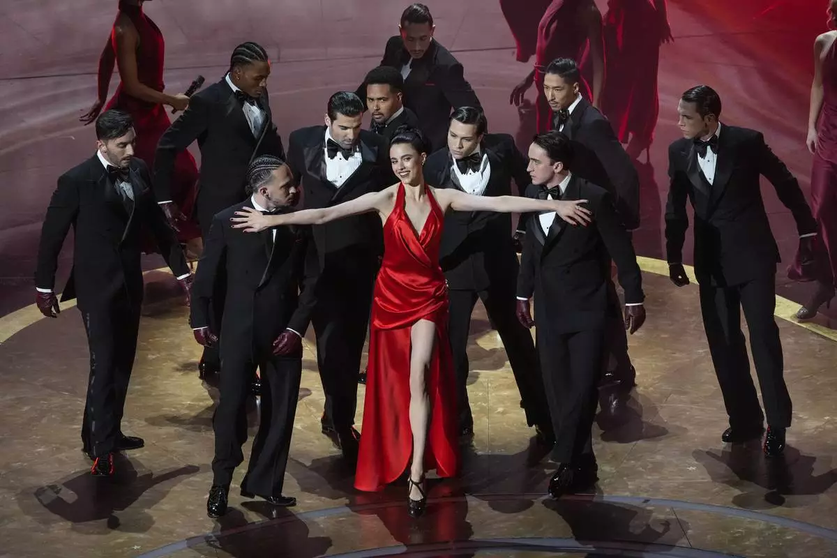 Margaret Qualley, center, performs during the Oscars on Sunday, March 2, 2025, at the Dolby Theatre in Los Angeles. (AP Photo/Chris Pizzello)