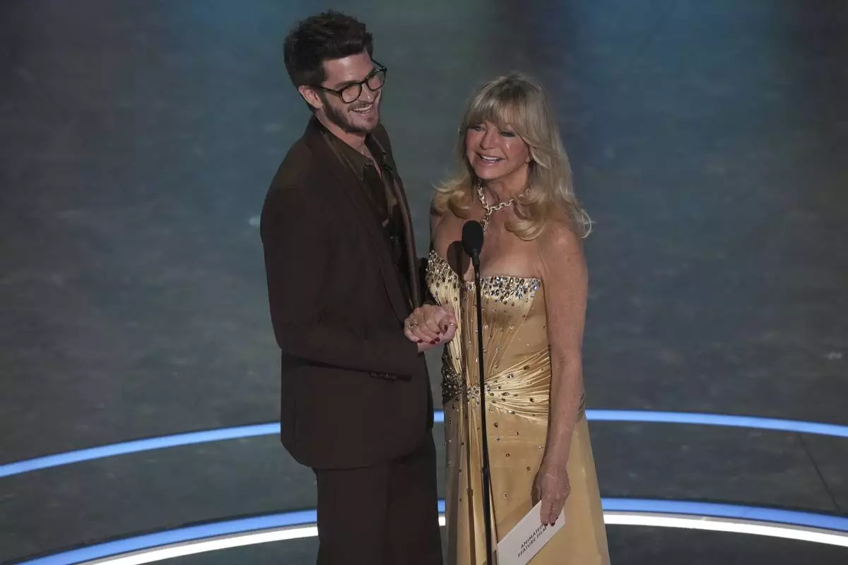 Andrew Garfield, left, and Goldie Hawn present the award for best animated feature film during the Oscars on Sunday, March 2, 2025, at the Dolby Theatre in Los Angeles. (AP Photo/Chris Pizzello)