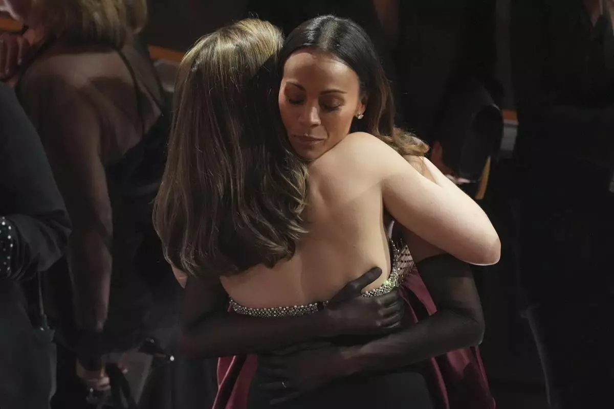 Ana de Armas, left, and Zoe Saldana embrace in the audience during the Oscars on Sunday, March 2, 2025, at the Dolby Theatre in Los Angeles. (AP Photo/Chris Pizzello)
