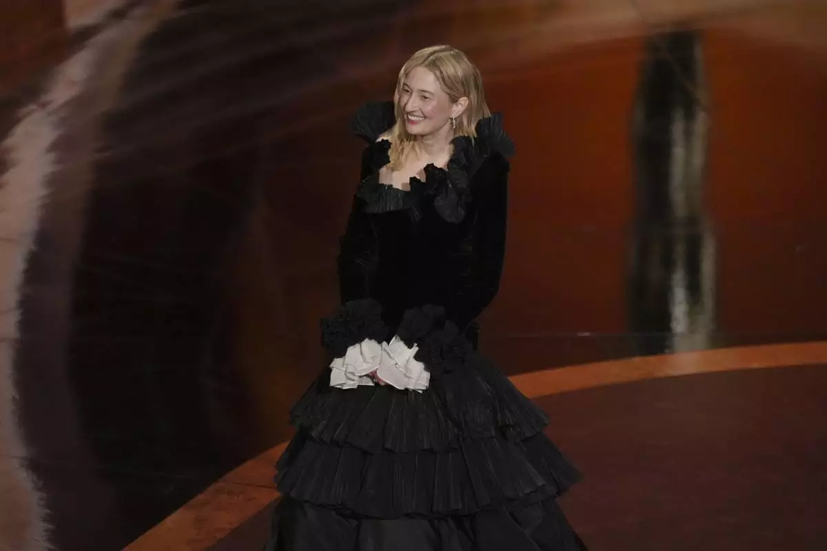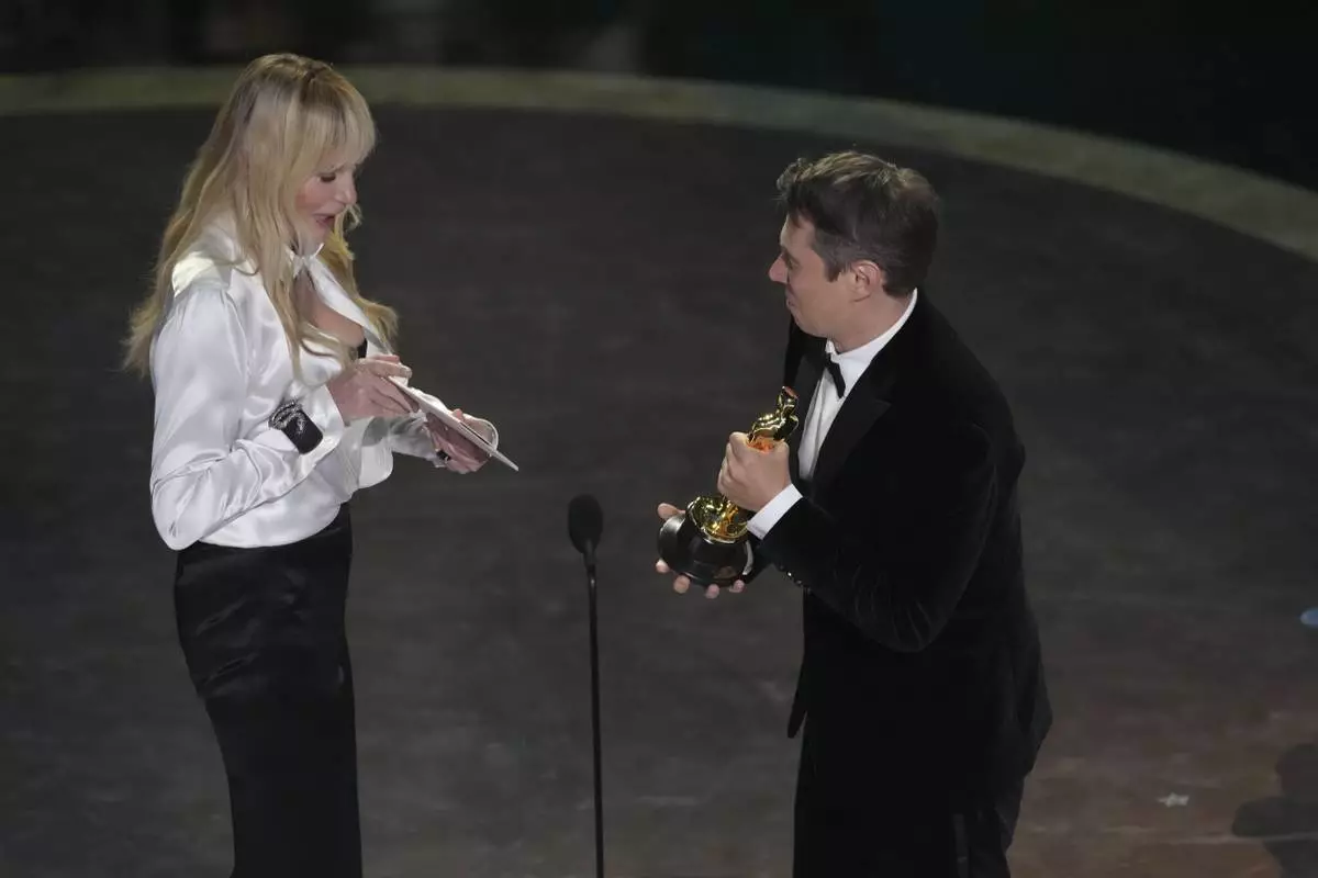 Daryl Hannah, left, presents the award for best film editing to Sean Baker for "Anora" during the Oscars on Sunday, March 2, 2025, at the Dolby Theatre in Los Angeles. (AP Photo/Chris Pizzello)