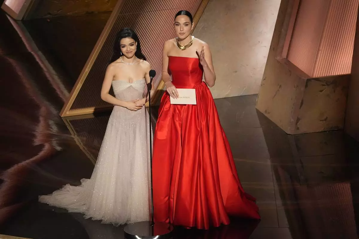 Rachel Zegler, left, and Gal Gadot present the award for best visual effects during the Oscars on Sunday, March 2, 2025, at the Dolby Theatre in Los Angeles. (AP Photo/Chris Pizzello)