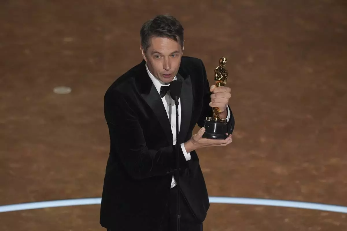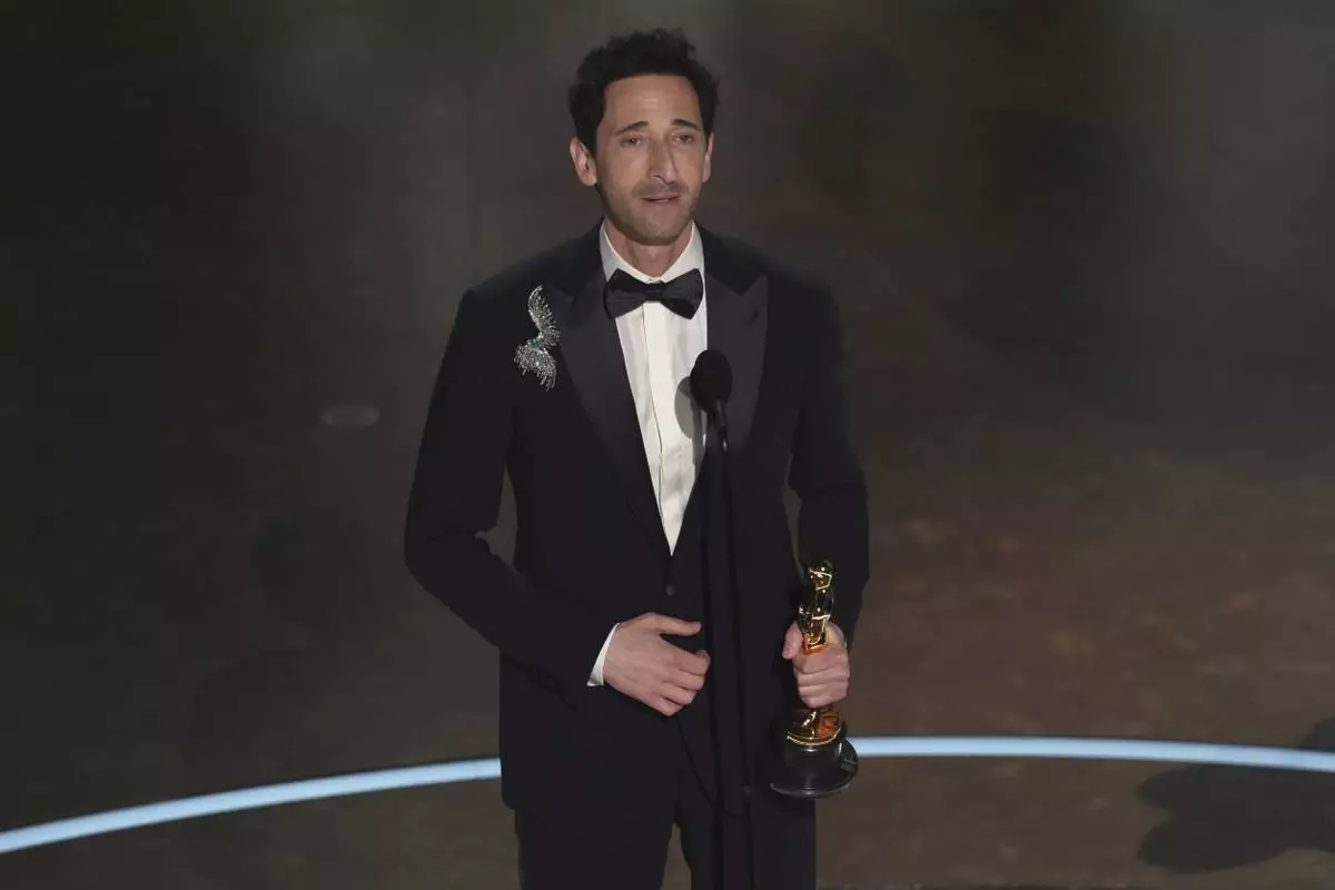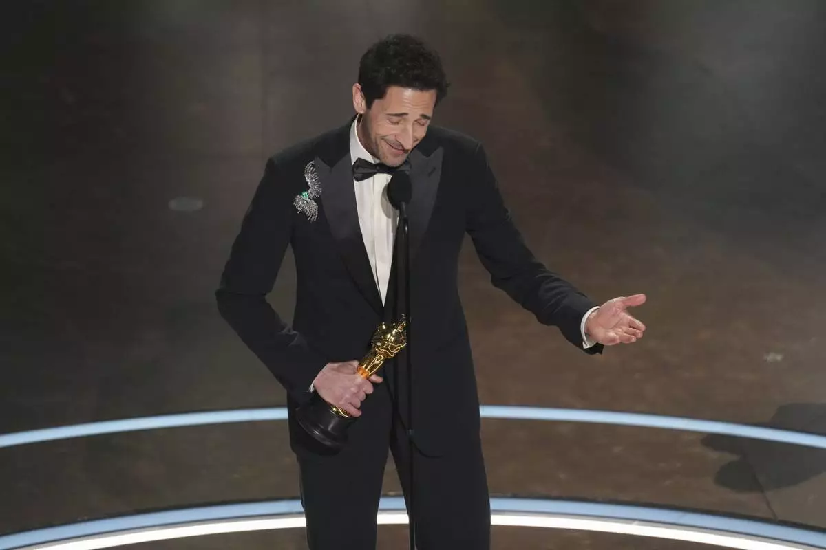 Adrien Brody accepts the award for best performance by an actor in a leading role for "The Brutalist" during the Oscars on Sunday, March 2, 2025, at the Dolby Theatre in Los Angeles.(AP Photo/Chris Pizzello)