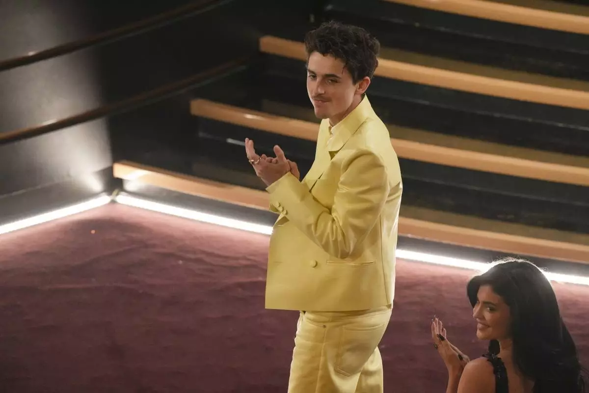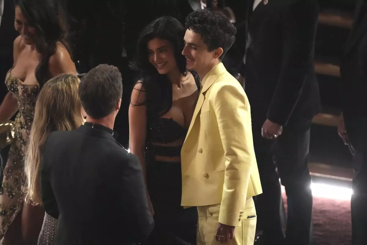 Timothee Chalamet, left, and Kylie Jenner in the audience during the Oscars on Sunday, March 2, 2025, at the Dolby Theatre in Los Angeles. (AP Photo/Chris Pizzello)