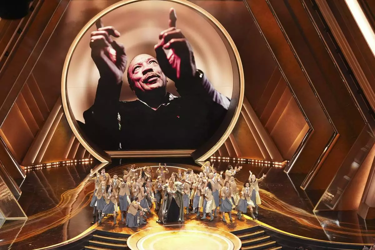 Whoopi Goldberg, left, and Oprah pay tribute to Quincy Jones during the Oscars on Sunday, March 2, 2025, at the Dolby Theatre in Los Angeles. (AP Photo/Chris Pizzello)
