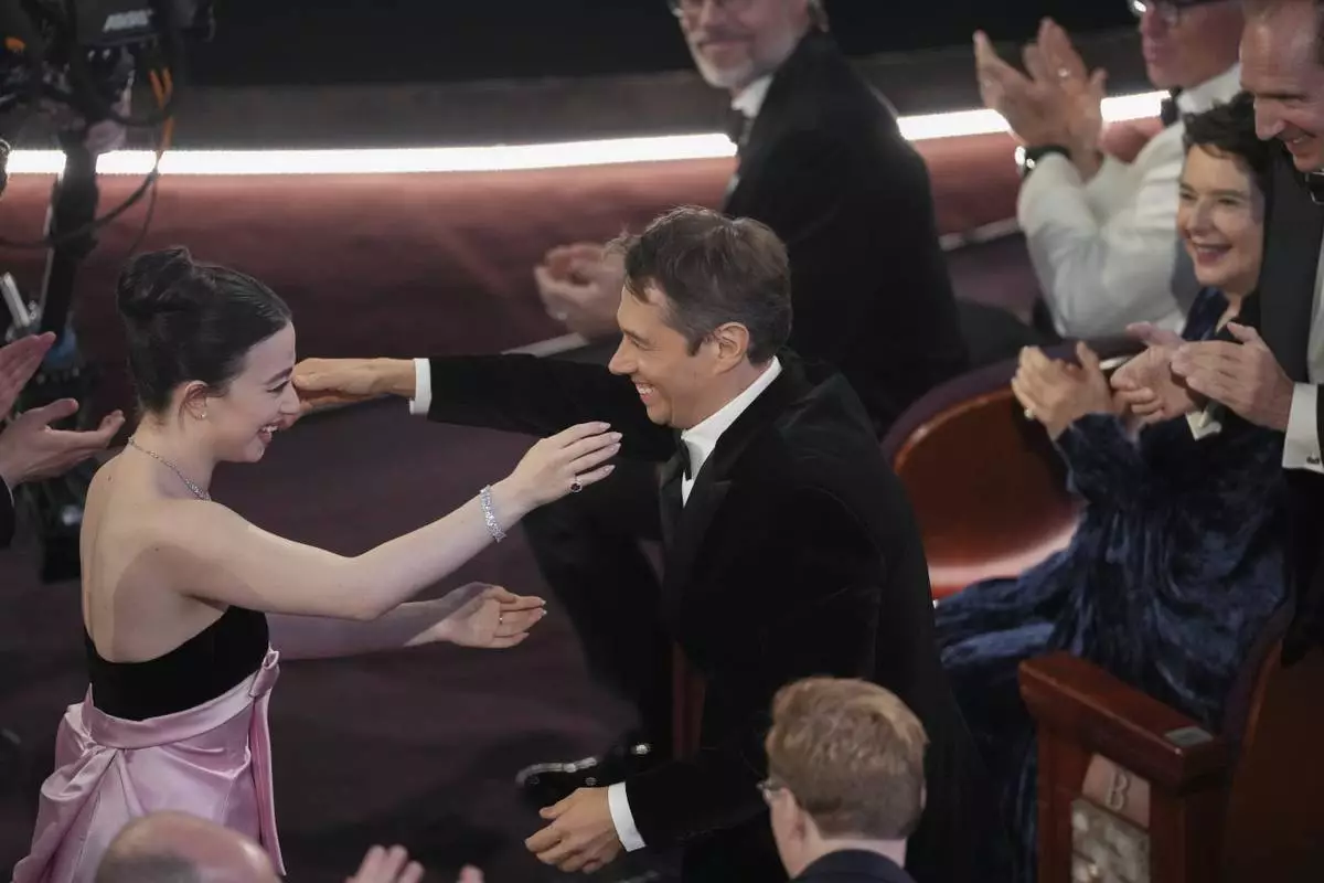 Mikey Madison, left, embraces Sean Baker after he wins the award for best original screenplay for "Anora" during the Oscars on Sunday, March 2, 2025, at the Dolby Theatre in Los Angeles. (AP Photo/Chris Pizzello)