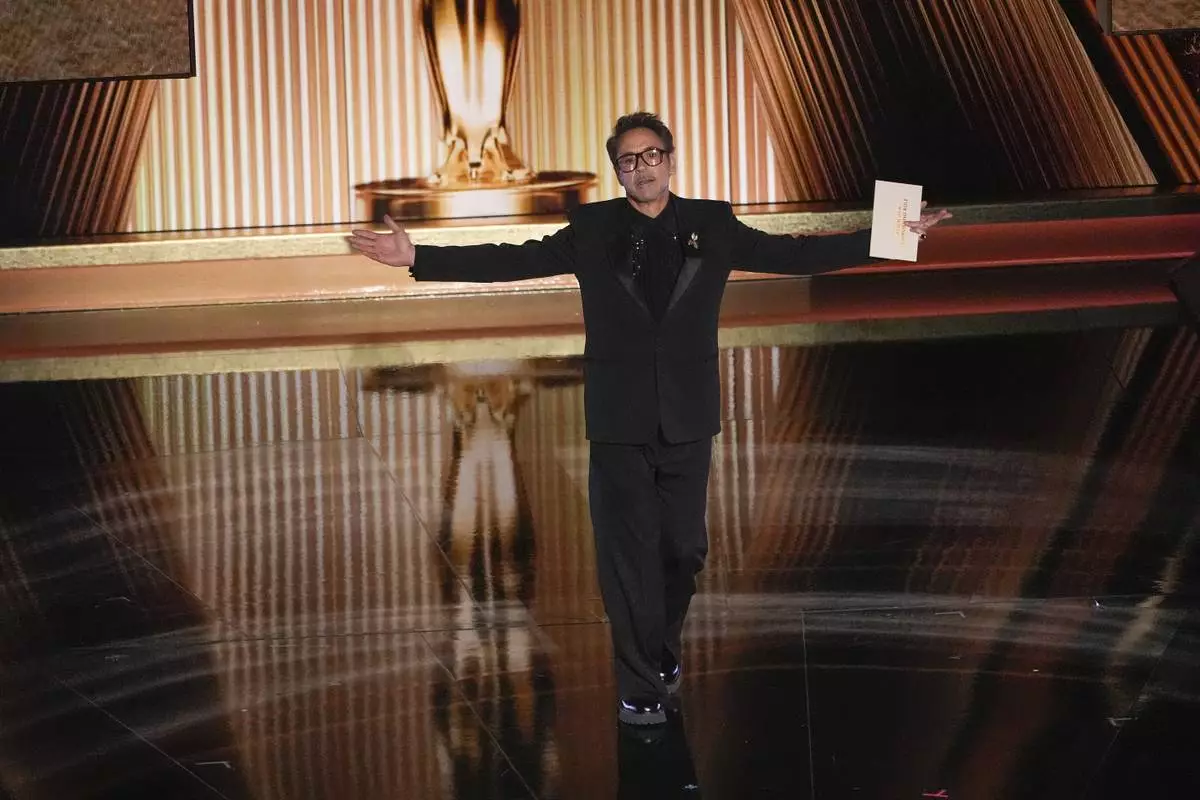 Robert Downey Jr. presents the award for best performance by an actor in a supporting role during the Oscars on Sunday, March 2, 2025, at the Dolby Theatre in Los Angeles. (AP Photo/Chris Pizzello)