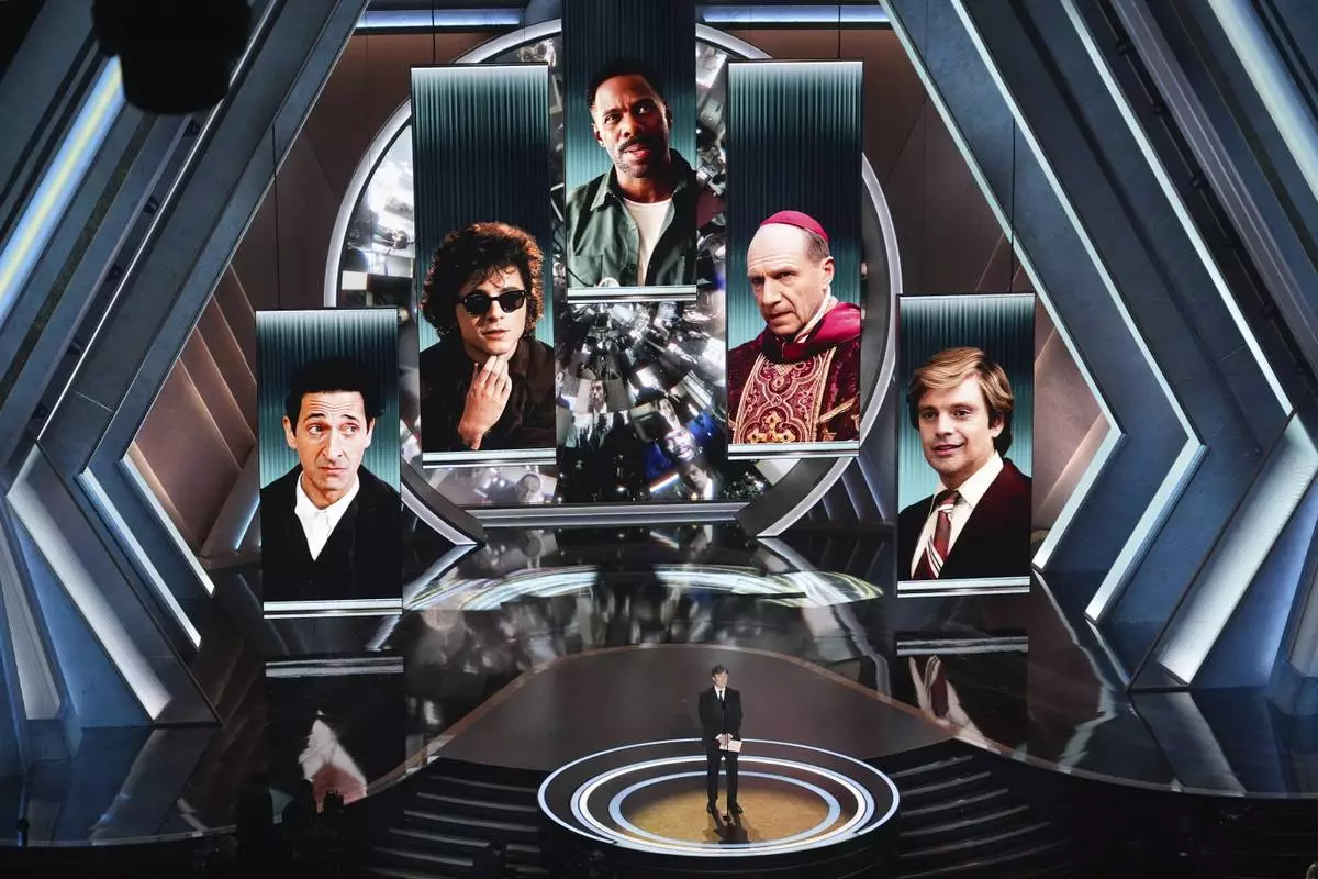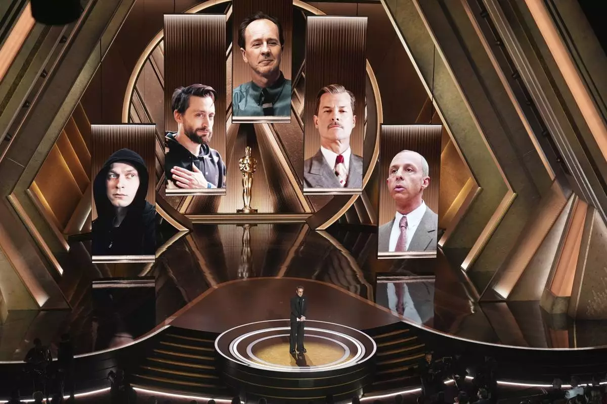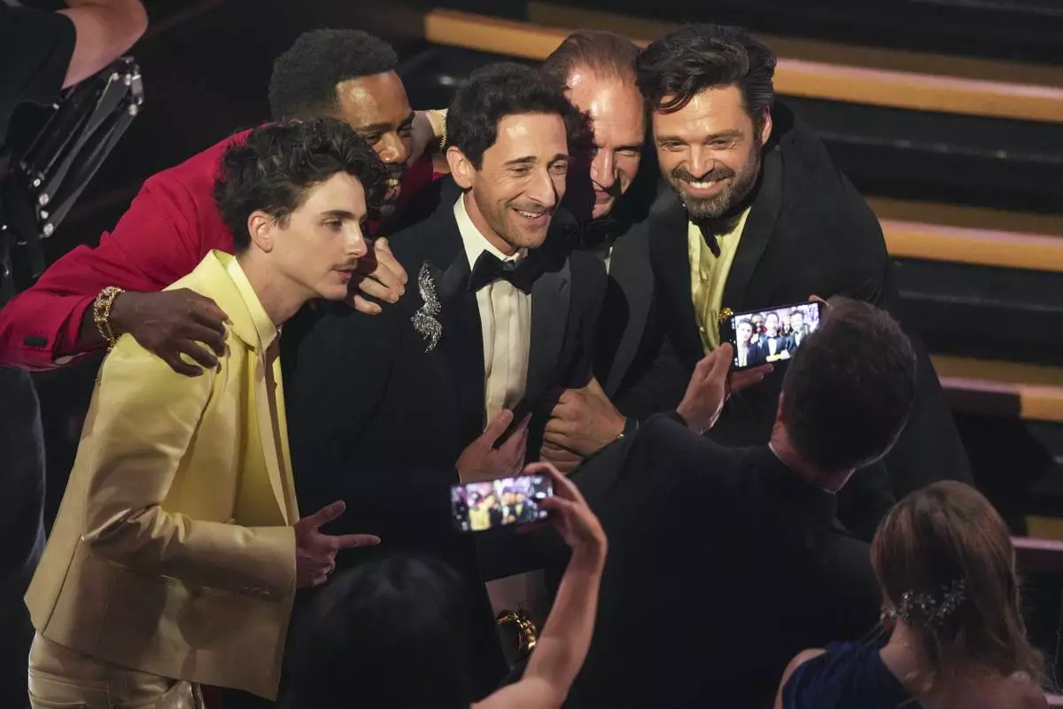 Timothee Chalamet, from left, Colman Domingo, Adrien Brody, Ralph Fiennes, and Sebastian Stan pose in the audience during the Oscars on Sunday, March 2, 2025, at the Dolby Theatre in Los Angeles. (AP Photo/Chris Pizzello)