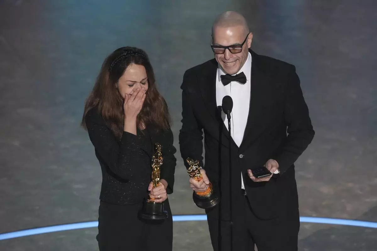 Shirin Sohani, left, and Hossein Molayemi accepts the award for best animated short for "In the Shadow of the Cypress" during the Oscars on Sunday, March 2, 2025, at the Dolby Theatre in Los Angeles. (AP Photo/Chris Pizzello)