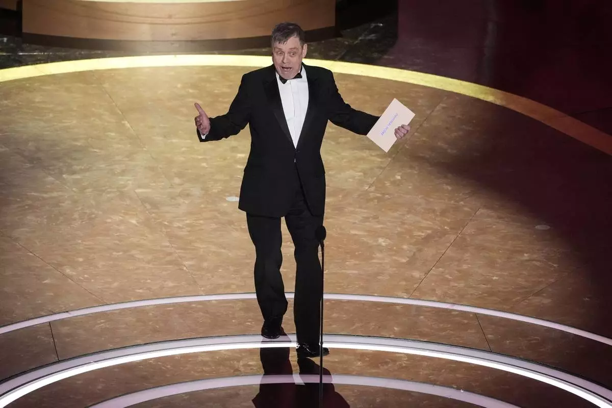 Mark Hamill presents the award for best original score during the Oscars on Sunday, March 2, 2025, at the Dolby Theatre in Los Angeles. (AP Photo/Chris Pizzello)