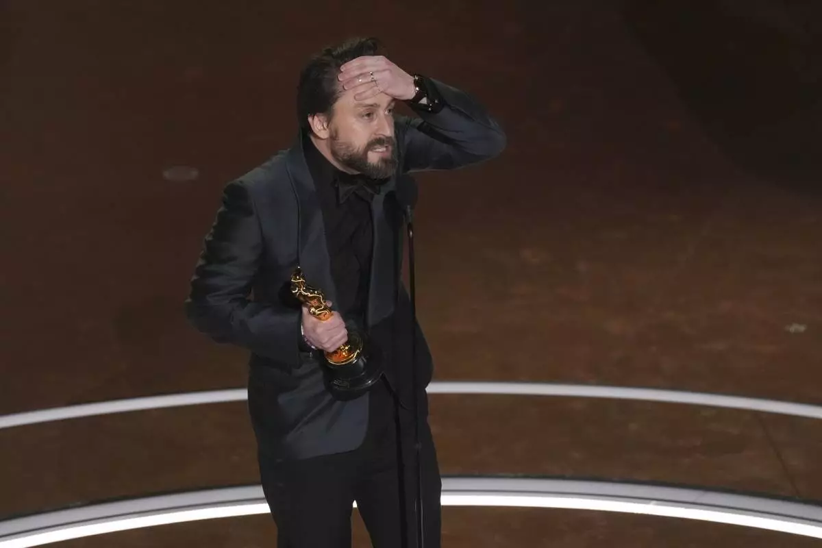 Kieran Culkin accepts the award for best performance by an actor in a supporting role for "A Real Pain" during the Oscars on Sunday, March 2, 2025, at the Dolby Theatre in Los Angeles. (AP Photo/Chris Pizzello)