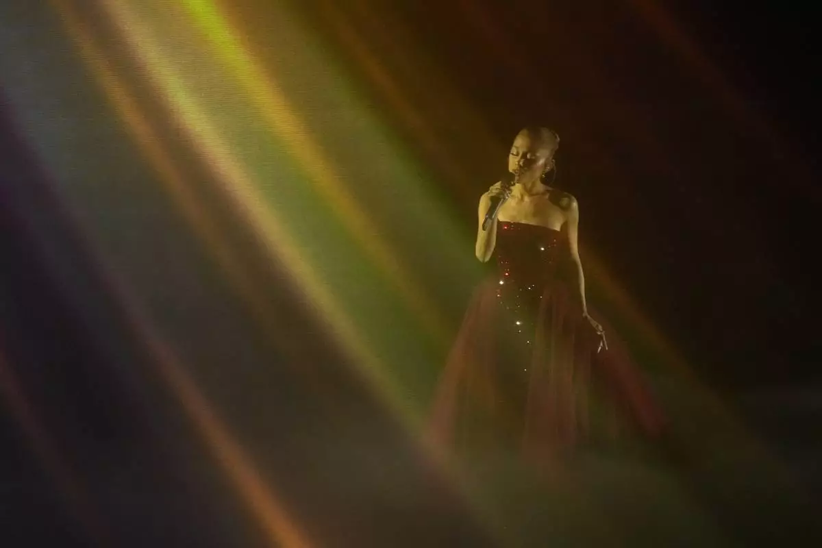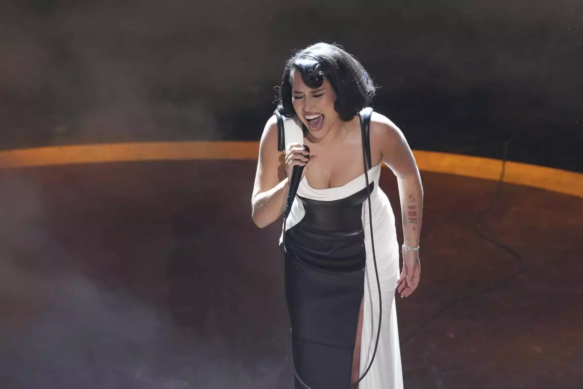 Raye sings "Skyfall" during the Oscars on Sunday, March 2, 2025, at the Dolby Theatre in Los Angeles. (AP Photo/Chris Pizzello)