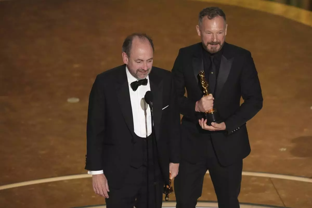 Nathan Crowley, left, and Lee Sandales accept the award for best production design for "Wicked" during the Oscars on Sunday, March 2, 2025, at the Dolby Theatre in Los Angeles. (AP Photo/Chris Pizzello)