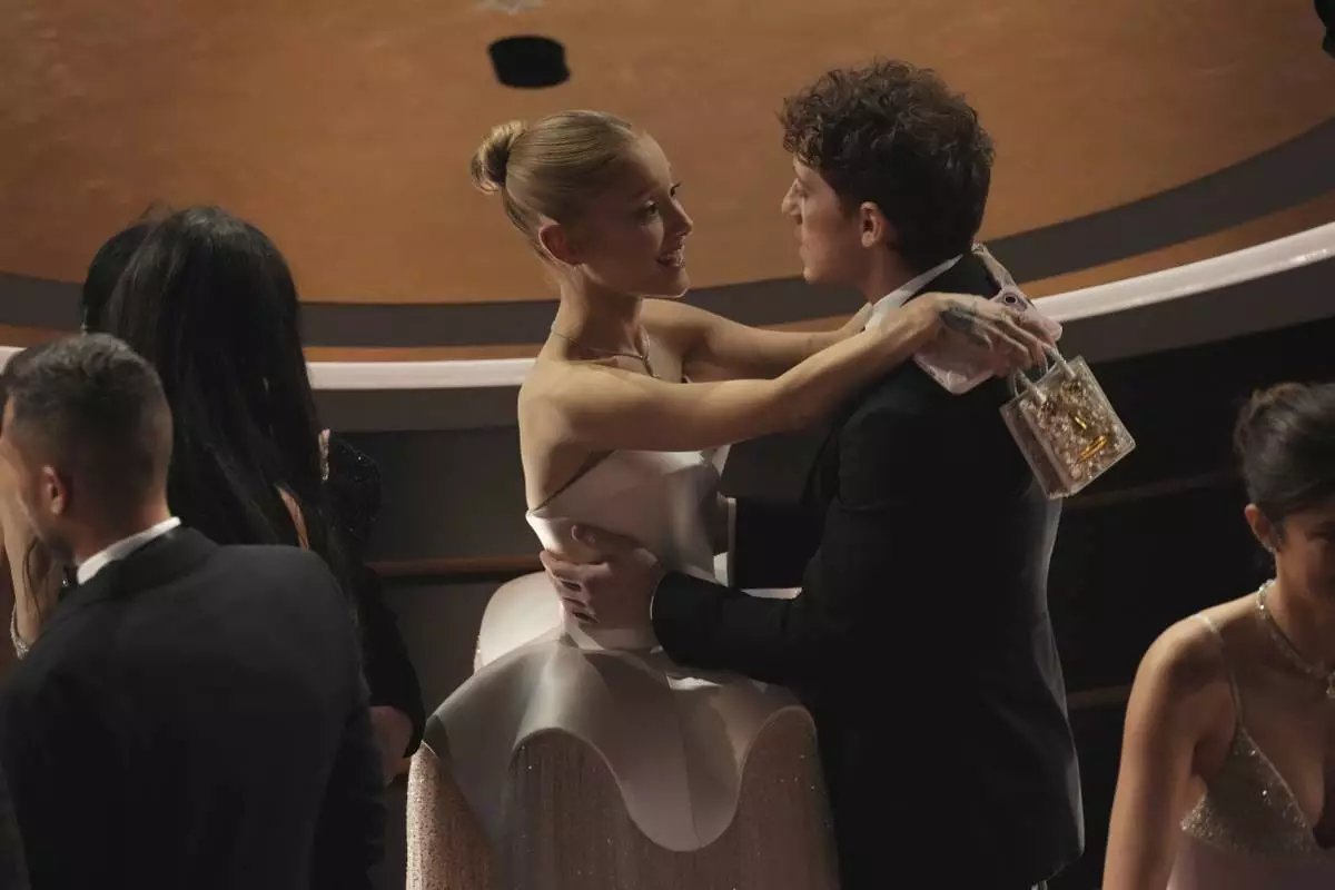 Ariana Grande, left, and Ethan Slater in the audience during the Oscars on Sunday, March 2, 2025, at the Dolby Theatre in Los Angeles. (AP Photo/Chris Pizzello)