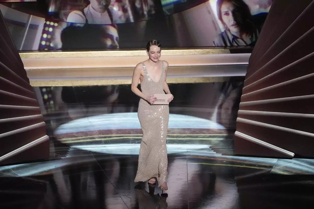 Emma Stone presents the award for best performance by an actress in a leading role during the Oscars on Sunday, March 2, 2025, at the Dolby Theatre in Los Angeles. (AP Photo/Chris Pizzello)