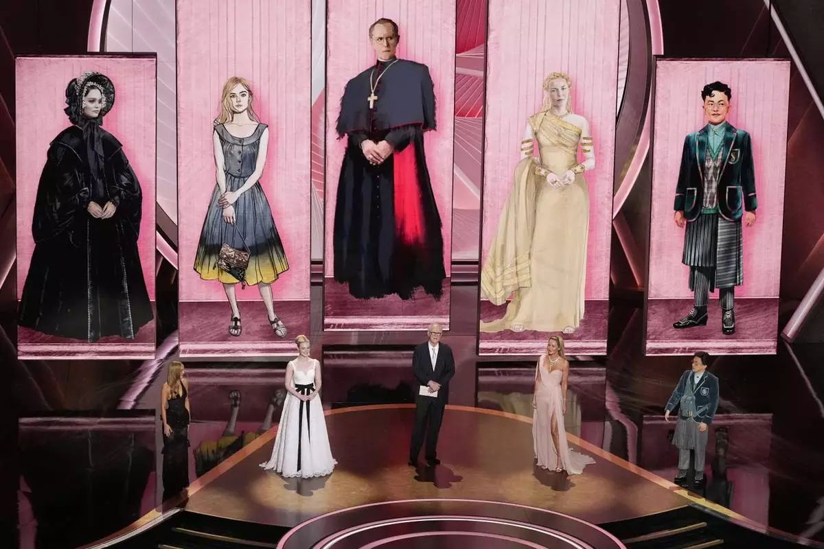 Lily-Rose Depp, from left, Elle Fanning, John Lithgow, Connie Nielsen and Bowen Yang presents the award for best costume design during the Oscars on Sunday, March 2, 2025, at the Dolby Theatre in Los Angeles. (AP Photo/Chris Pizzello)