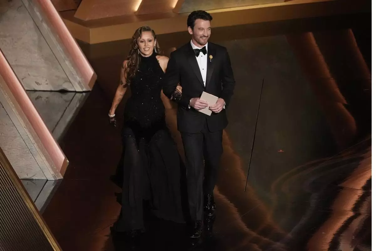 Miley Cyrus, left, and Miles Teller present the award for best sound during the Oscars on Sunday, March 2, 2025, at the Dolby Theatre in Los Angeles. (AP Photo/Chris Pizzello)