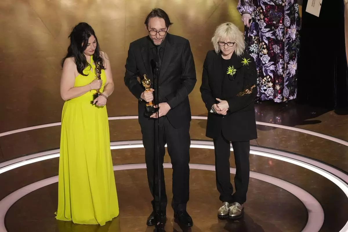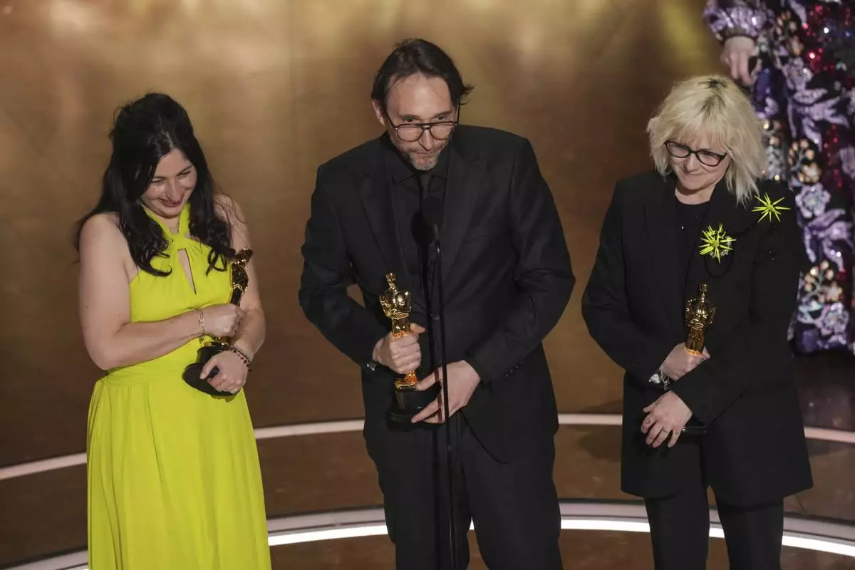 Marilyne Scarselli, from left, Pierre-Olivier Persin, and Stephanie Guillon accept the award for best makeup and hairstyling for "The Substance" during the Oscars on Sunday, March 2, 2025, at the Dolby Theatre in Los Angeles. (AP Photo/Chris Pizzello)